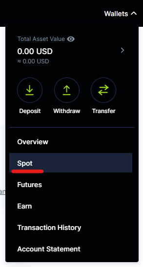 Navigate to the Traiex Wallet Page > Choose "Spot" under Wallet Type.