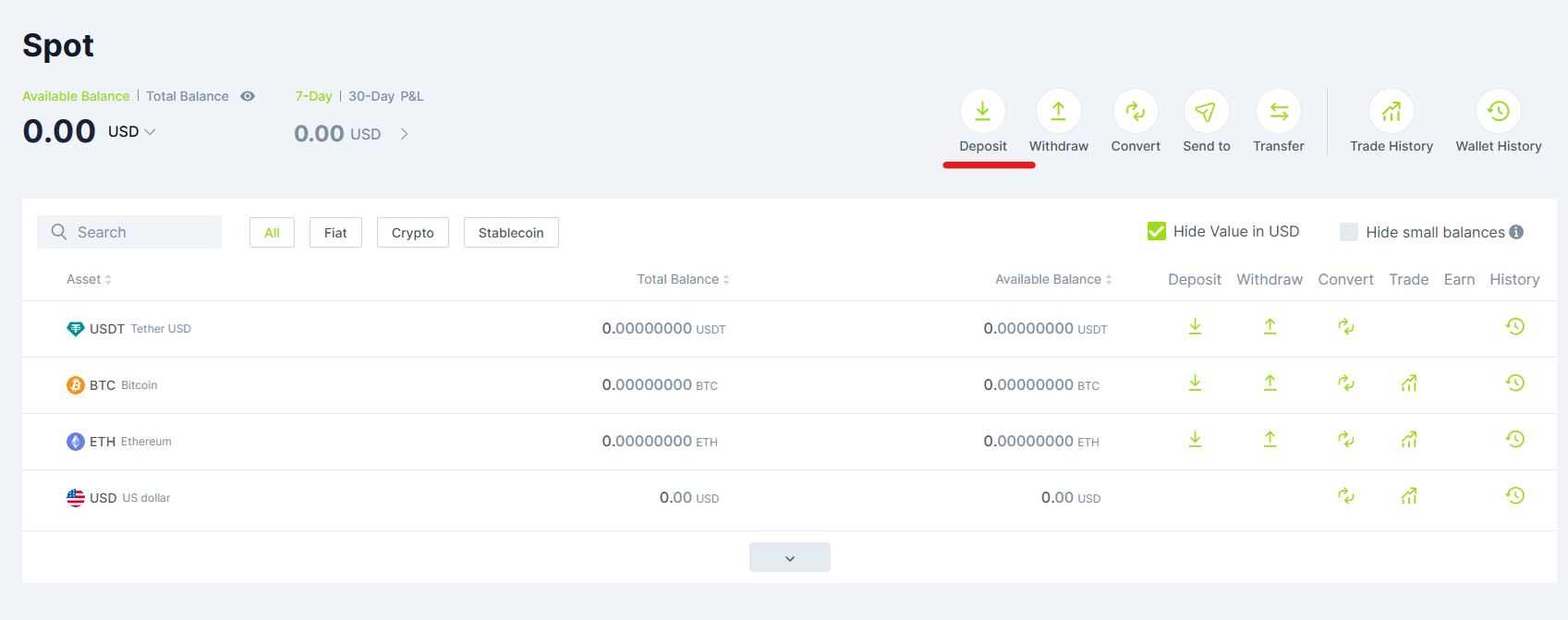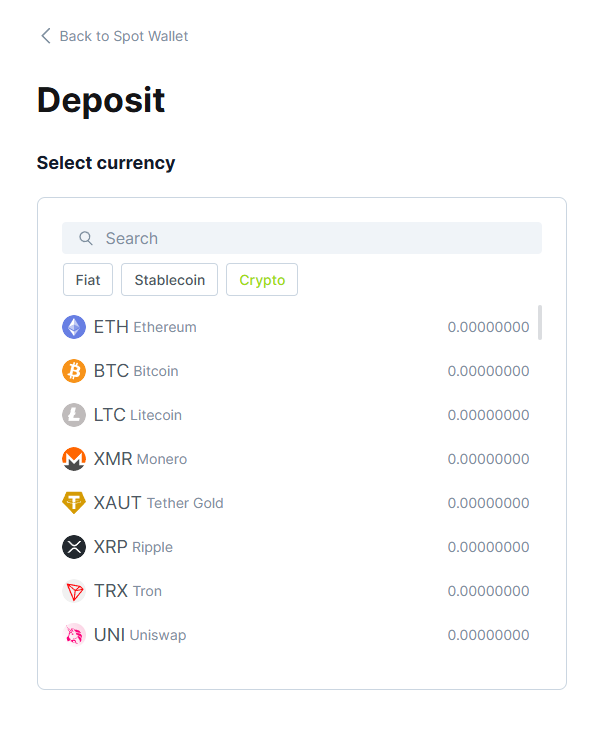 Choose your preferred cryptocurrency from the list or use the search feature. Then, click the “Deposit” icon.