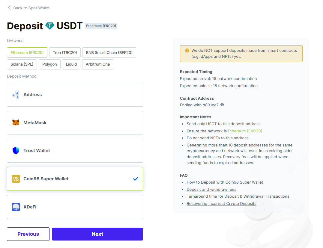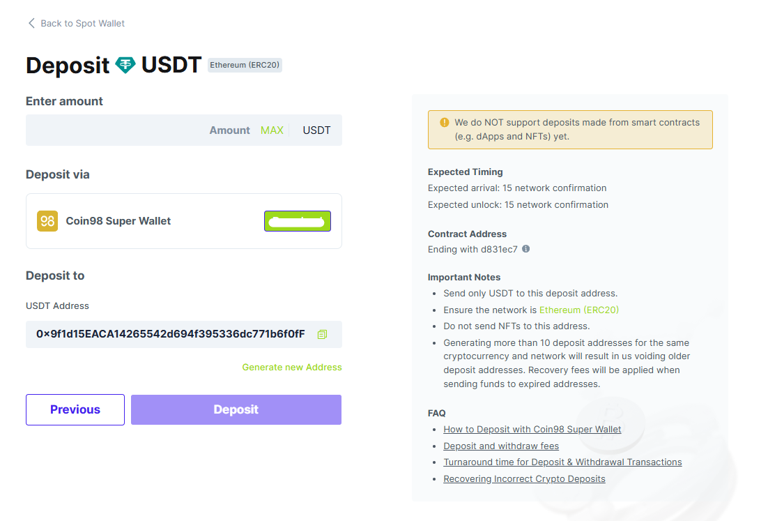 If you want to deposit with your Coin98 Super Wallet, kindly visit the Traiex Wallet page and follow the steps below: