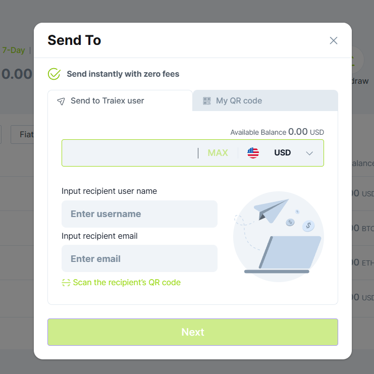 The "Send to" function, also known as "Internal Transfer", allows Traiex customers to transfer funds from their Traiex account to other Traiex accounts.