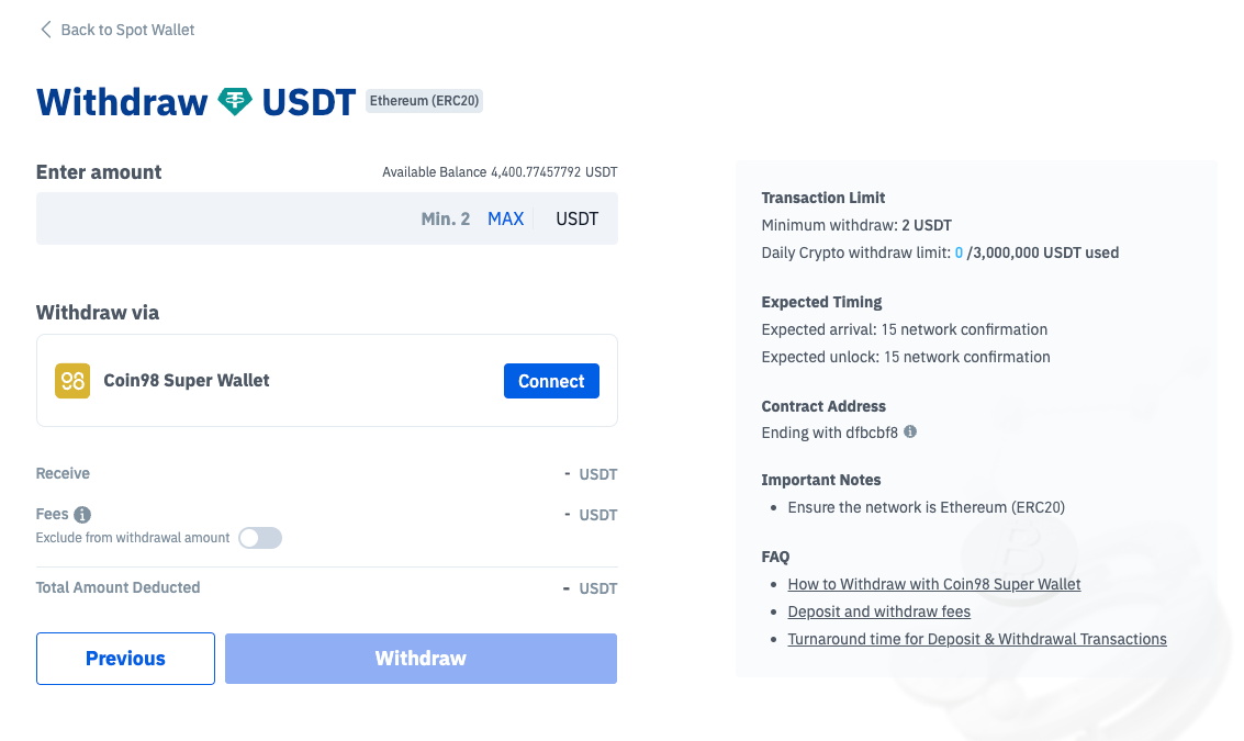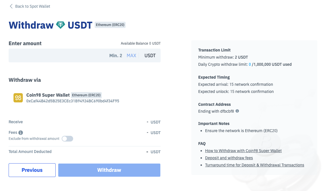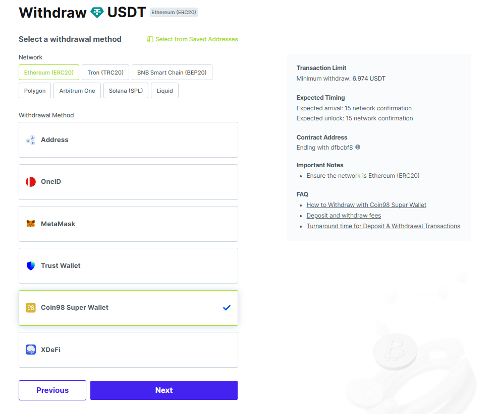 Note: After making your Coin98 Super Wallet as your default withdrawal address, all supported cryptocurrencies will automatically be enabled.