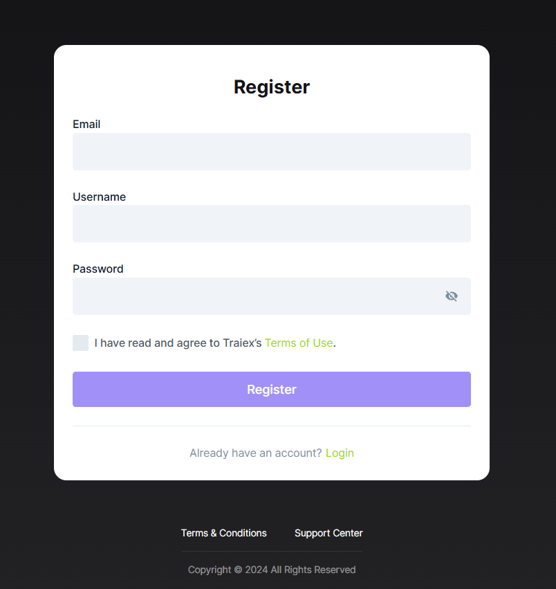 On the Traiex homepage, click "Register" or follow the link to fill out the registration form.