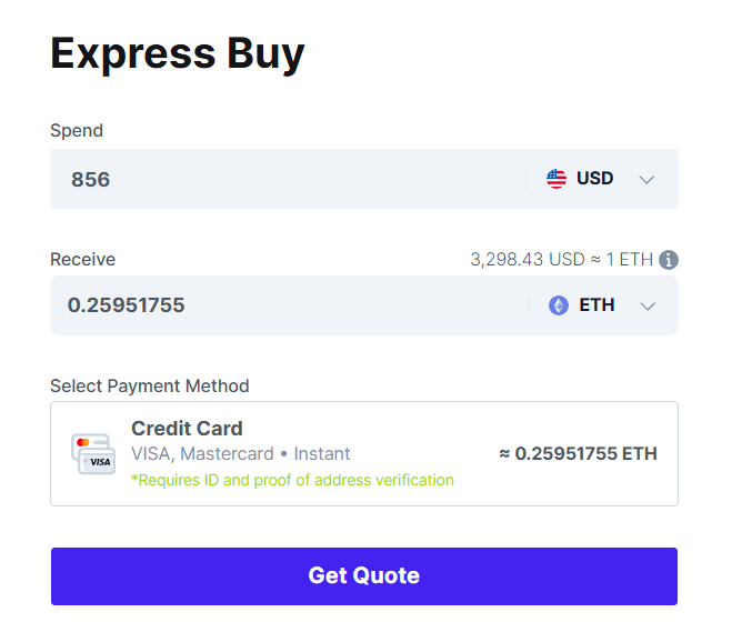 To get a quotation of the cryptocurrency you would like to purchase, enter the amount you wish to buy, select the fiat currency you will spend, and the cryptocurrency you would like to purchase, and click "Get Quote"