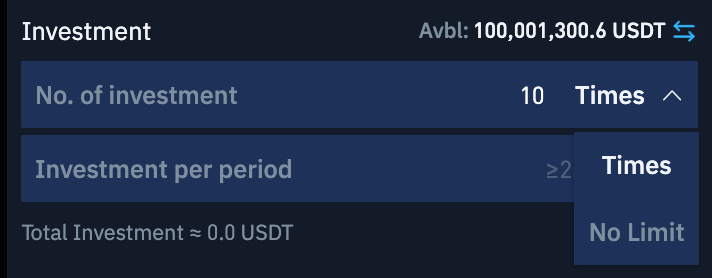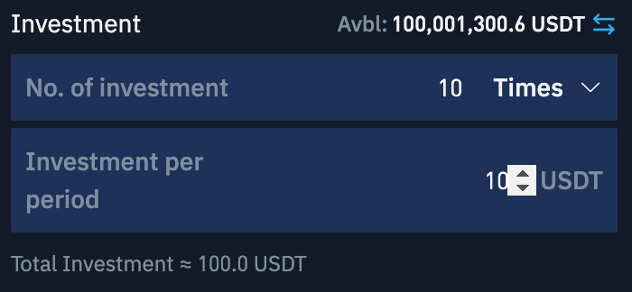 You can designate the investment amount in your quote currency and the number of times you wish to make this investment. The total investment will be calculated as the amount per period multiplied by the number of investments.