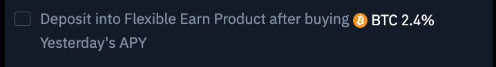 Yes, you will have an option to enable or disable automatic deposits of purchased cryptocurrency into a flexible earning product.. The bot will display the previous day's APY for your reference.