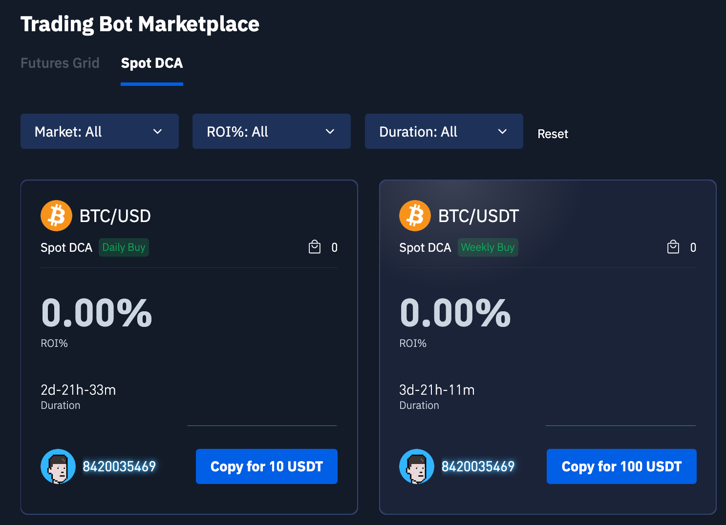 You can filter and sort DCA bots based on various criteria such as market, ROI, duration, and more. This helps you find bots that align with your trading preferences.