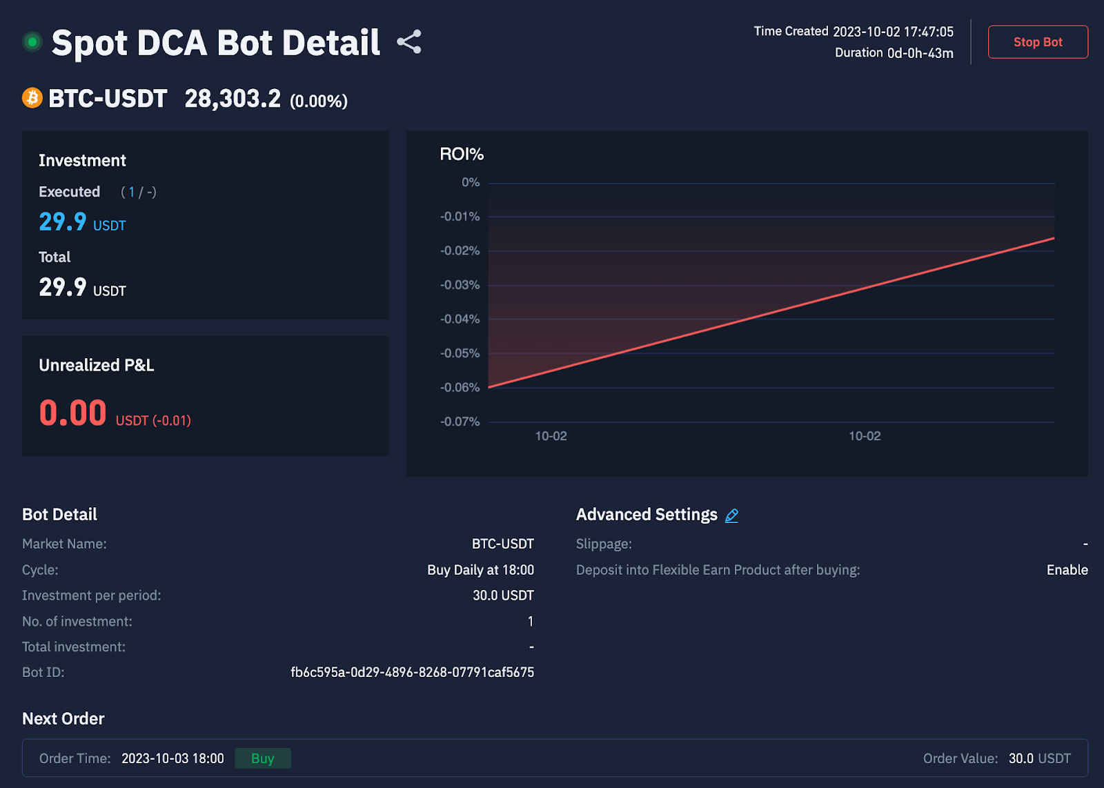 If the funds in your account fall short of the necessary minimum investment, the bot is unable to carry out orders. As a result, you'll observe an "order failure due to insufficient funds" notification on the bot's information page.