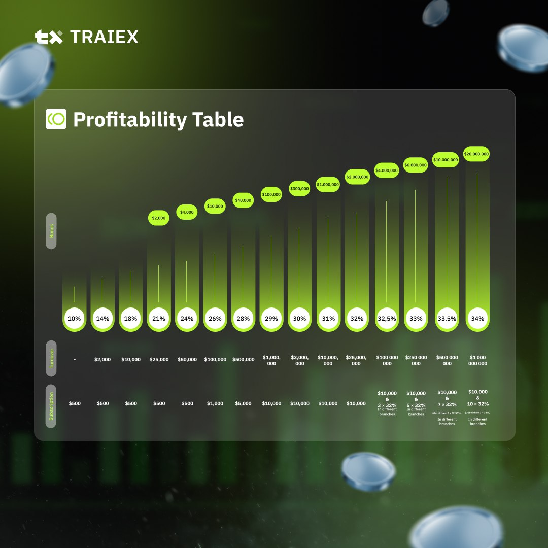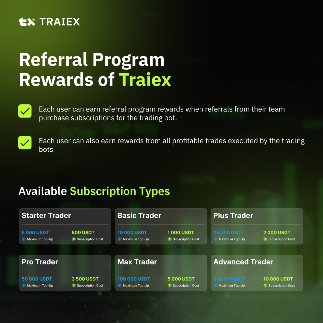 Example: if your referral purchases a subscription for 1000 USDT, and your own active subscription costs 500 USDT, then with a 10% referral rate, you will receive only 50 USDT as a bonus — not the full 100 USDT.